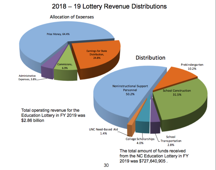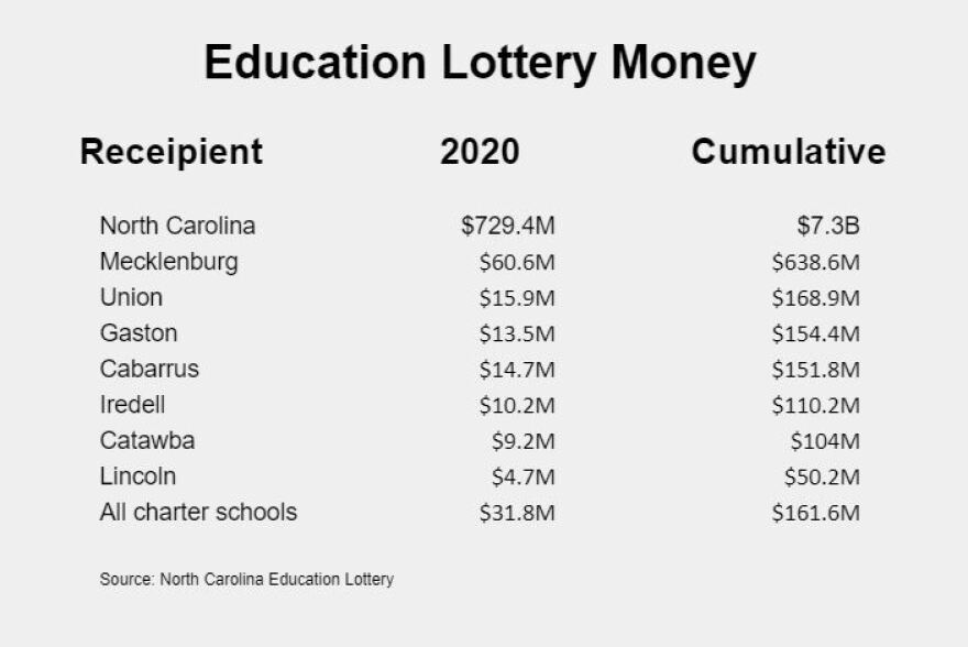 Both recall being intrigued by the lottery when North Carolina lawmakers approved it in 2005. And they've watched it grow: In 2007, the lottery brought in $886 million. Last year it was close to $3 billion. Mecklenburg County has been the largest recipient of lottery money over the years.