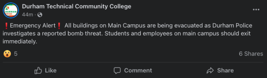 Around 11 a.m. on Thursday, Durham Technical Community College posted an emergency alert on its Facebook page telling everyone on main campus to shelter in place because of a bomb threat it had received.