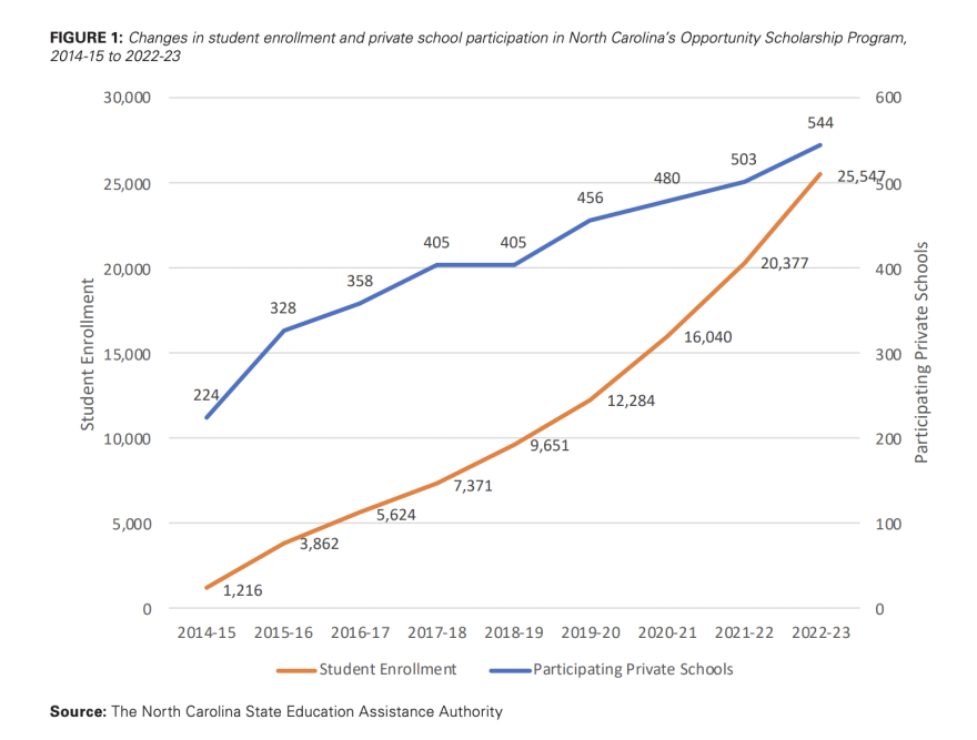 A June 2023 report from the North Carolina Justice Center identified 62 instances in which the number of vouchers distributed appears to have exceeded the total enrollment of the schools receiving them, as well as schools that received voucher money after they stopped reporting data to the state’s private school directory. In response to WFAE’s queries, the SEAA issued a statement saying discrepancies between enrollment and scholarship recipients may stem from comparing data from two agencies that use different methods.