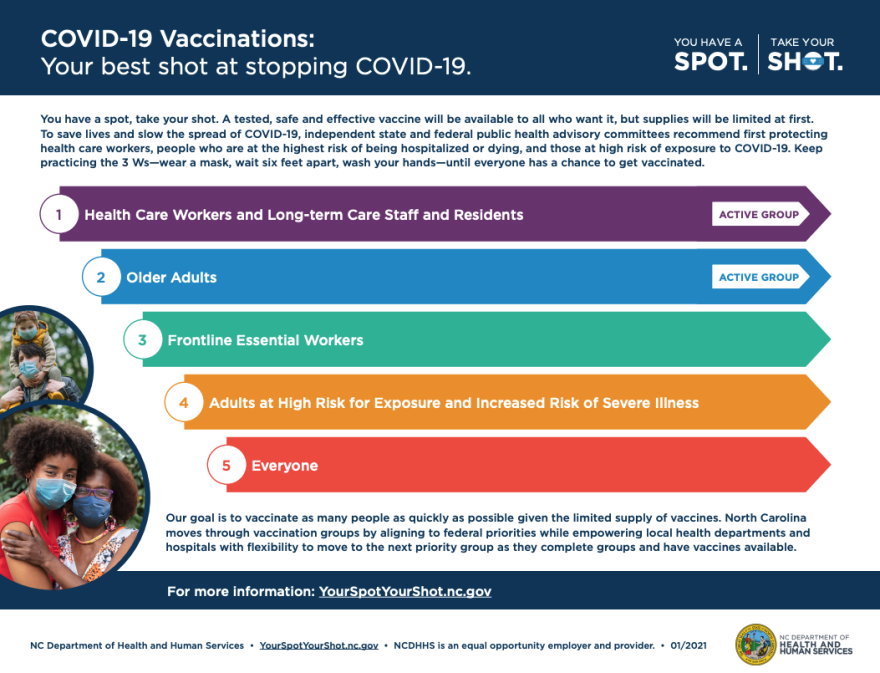 The new state plan no longer prioritizes college students above the general population. Cohen said the changes incorporate recent directives from the Trump Administration to administer vaccinations more quickly while focusing on people who need it most. She said the new plan is intended to give local health departments and hospitals more flexibility to "move to the next priority group as they complete the previous one." - Laura Pellicer and Will Michaels, WUNC