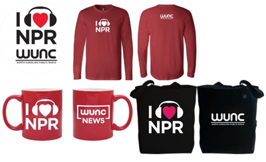 If you love WUNC and NPR, then you can request the Lots of Love Pack as your thank you gift! It includes a WUNC car magnet, tote bag, mug and t-shirt, all featuring the WUNC and I Heart NPR logos!
