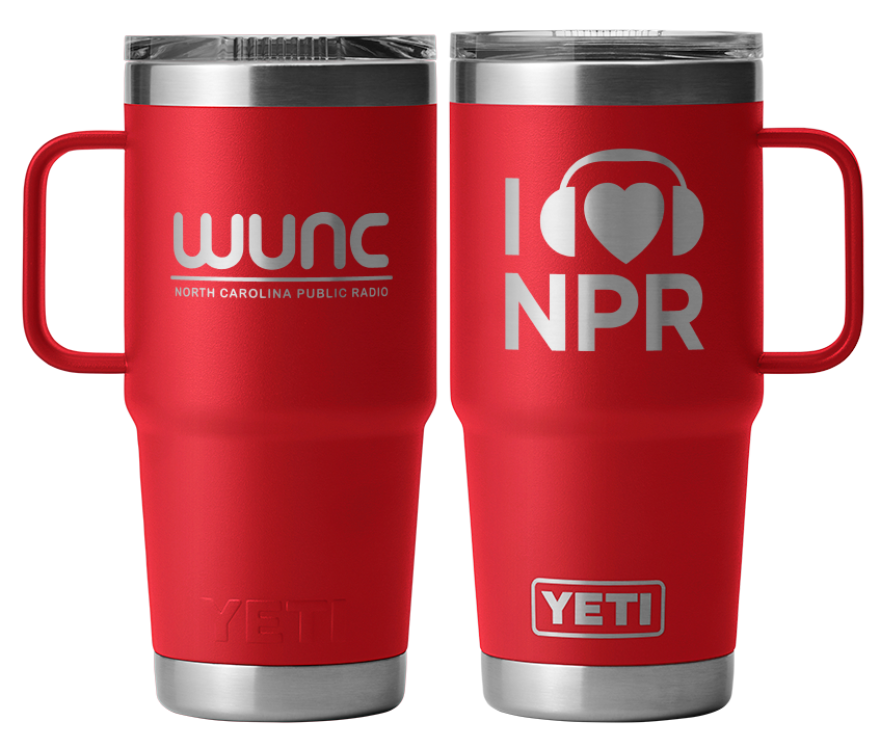 Get your WUNC YETI travel mug! This red 20 ounce YETI Rambler mug includes a handle and lid, and features the WUNC logo and the I Heart NPR logos.